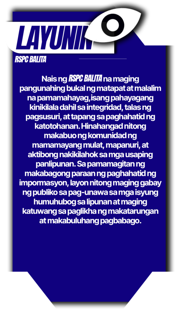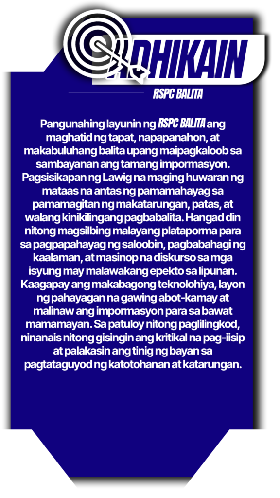 ANG RSPC BALITA ay itinatag bilang isang pangunahing online na pahayagan na nagsisilbing daluyan ng mapagkakatiwalaang impormasyon, matalas na pagsusuri, makahulugang salaysay, at pinakabagong kaganapan sa bansa. Layunin nitong maging tinig ng sambayanan magbibigay-liwanag sa mga Pilipino hinggil sa mahahalagang isyung nararapat pagtuunan ng atensyon at malalim na pagninilay.